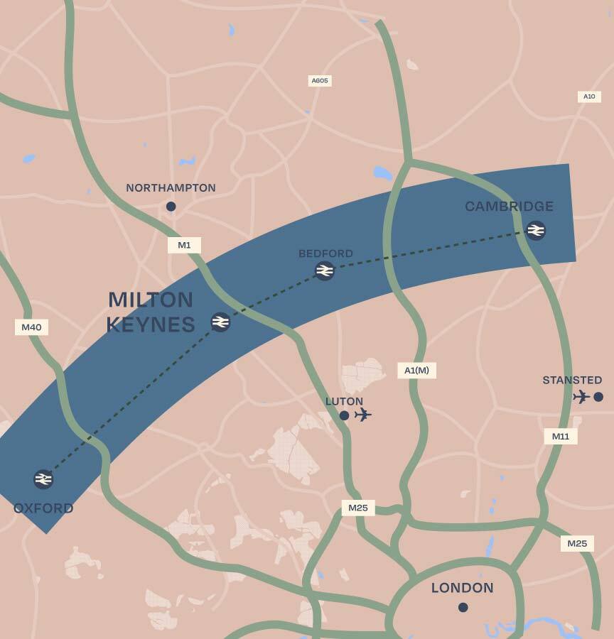 Milton Keynes is strategically located at the centre point between London, Birmingham, Oxford and Cambridge.
